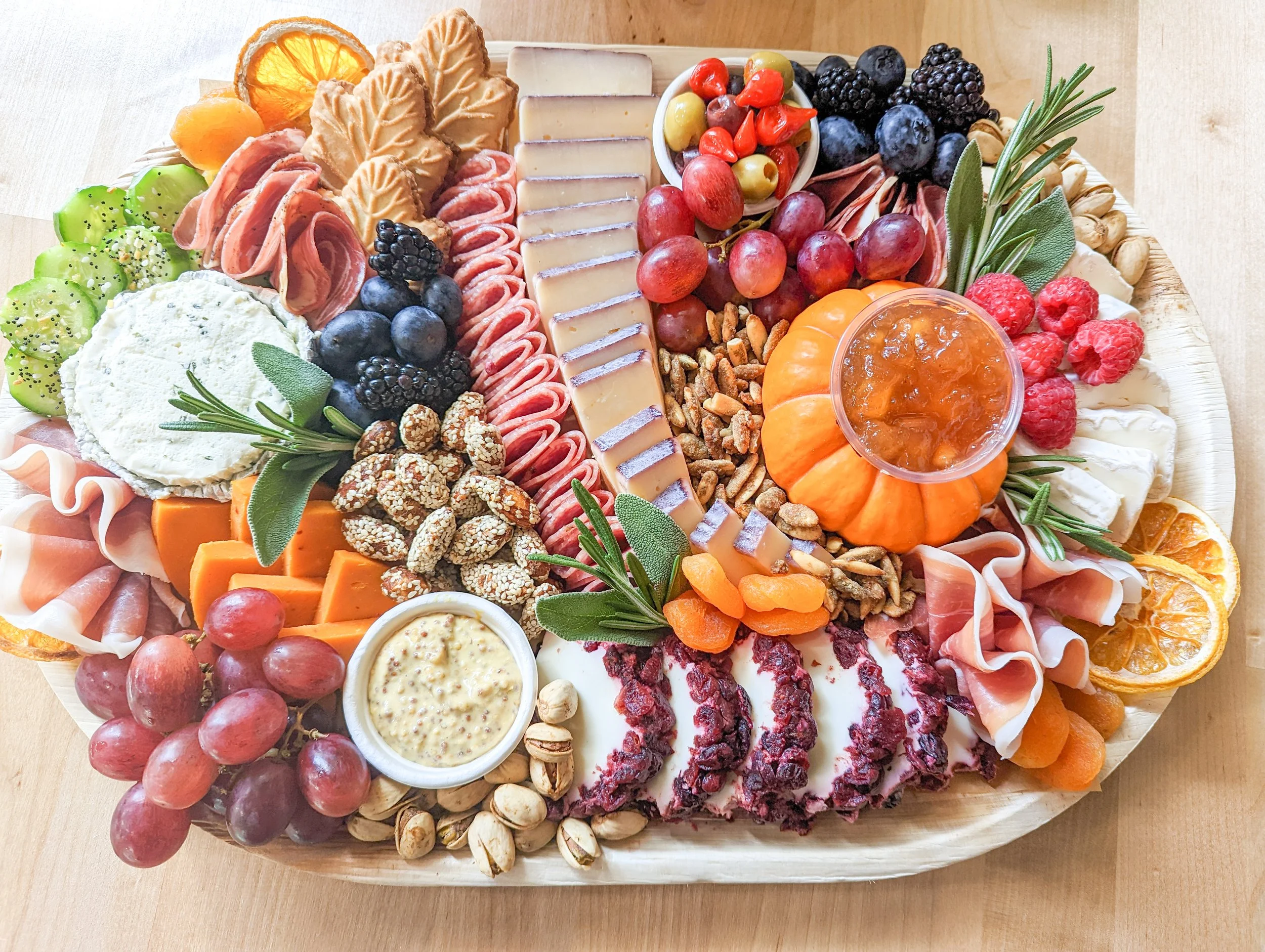 Our largest Thanksgiving board is a 22x12 Oval board with 6 cheeses, 3 charcuterie, 2 dips, assorted seasonal fruits, accompaniments and a side cracker board. Perfect for 15-20 people as appetizers. Pickup or delivery only available for Wednesday, November 27th from 11am-2pm. Delivery is billed separately