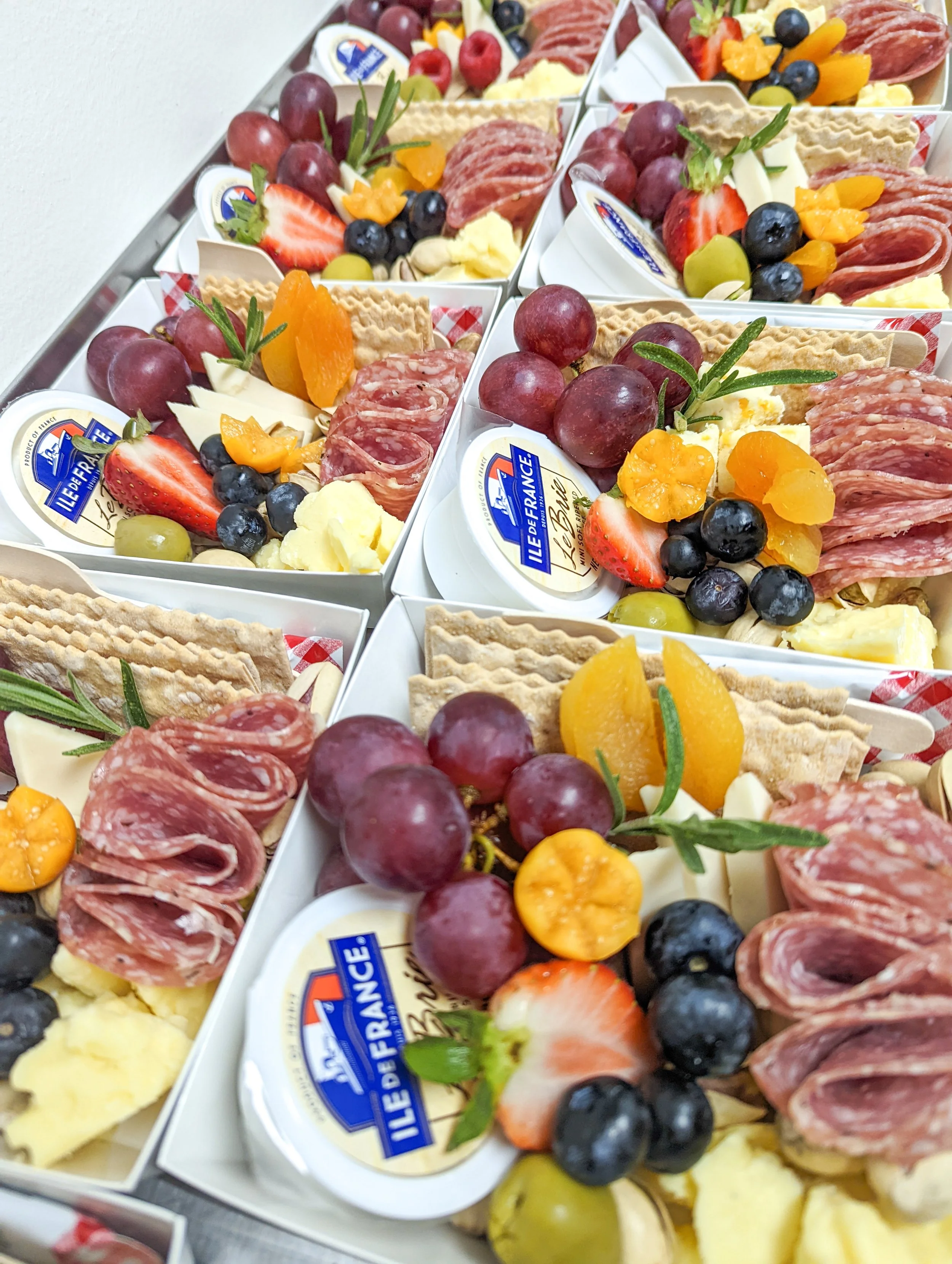 A personal size filled with 2 cheeses, 1 charcuterie meat, seasonal fruit, crackers and a sweet.